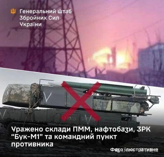 乌军还摧毁俄军“山毛榉”M1防空系统、步兵旅指挥所、弹药和后勤仓库、无人机库,以及燃料库和石油码头。